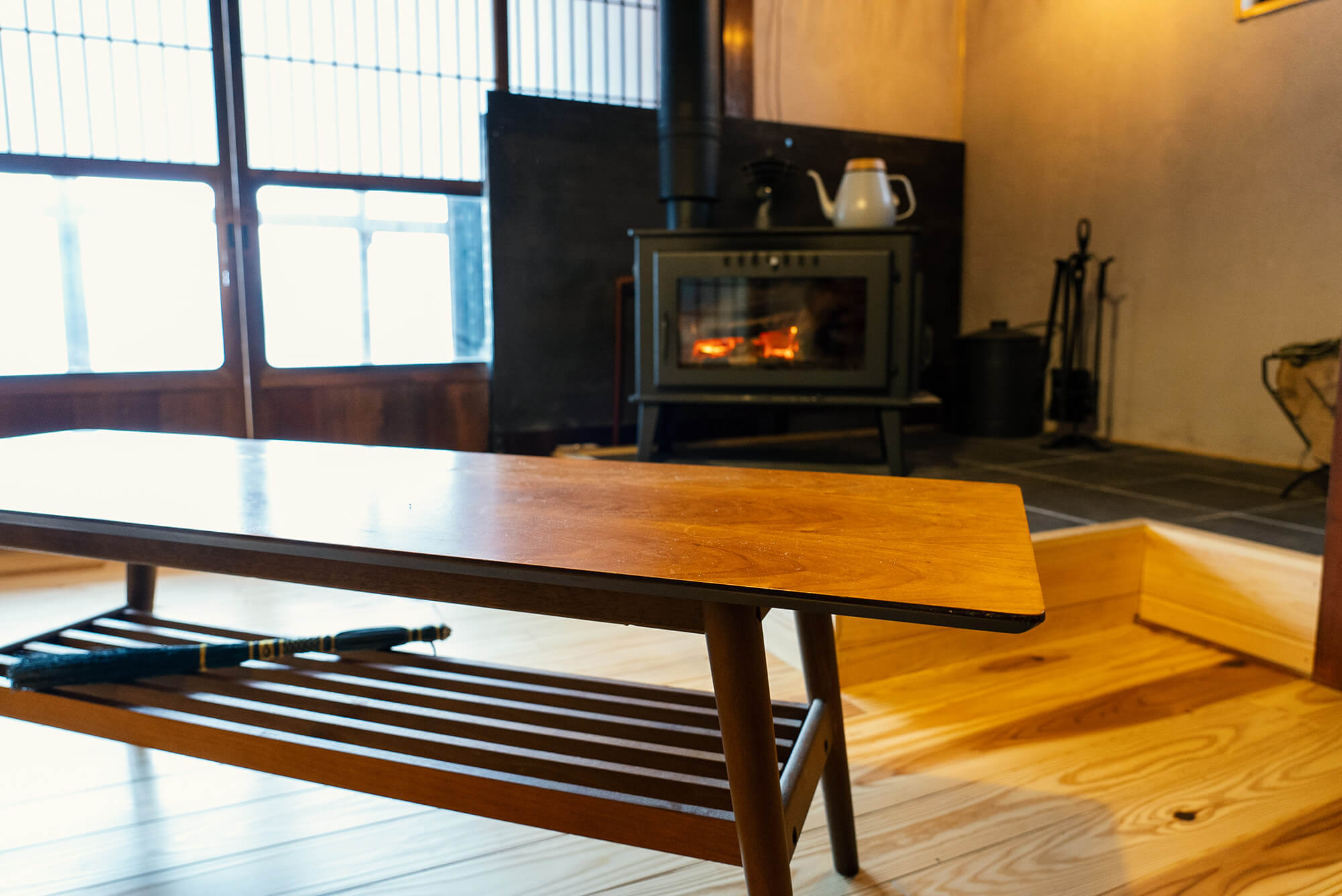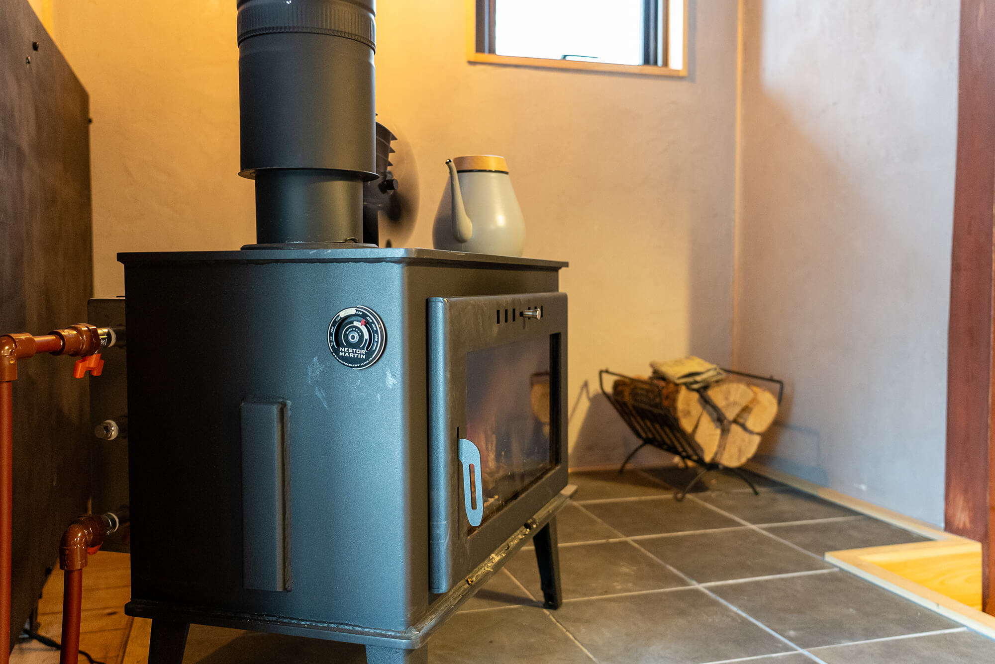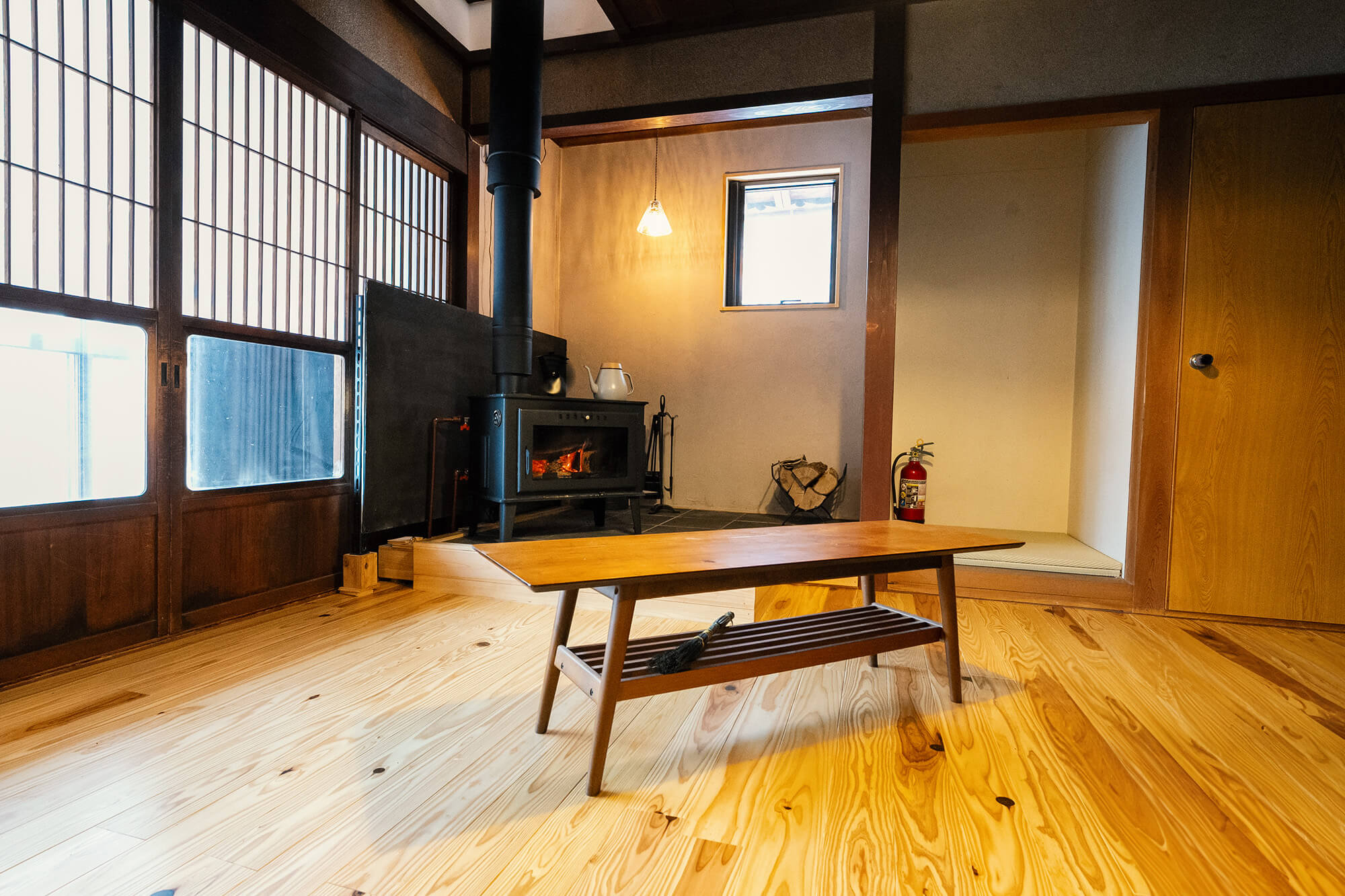 1階の居間には薪ストーブ。しかも温水薪ストーブなので床も暖かく、じんわりと心と体をほぐします。薪ストーブは吹き抜けを利用し2階も十分に暖めてくれます。