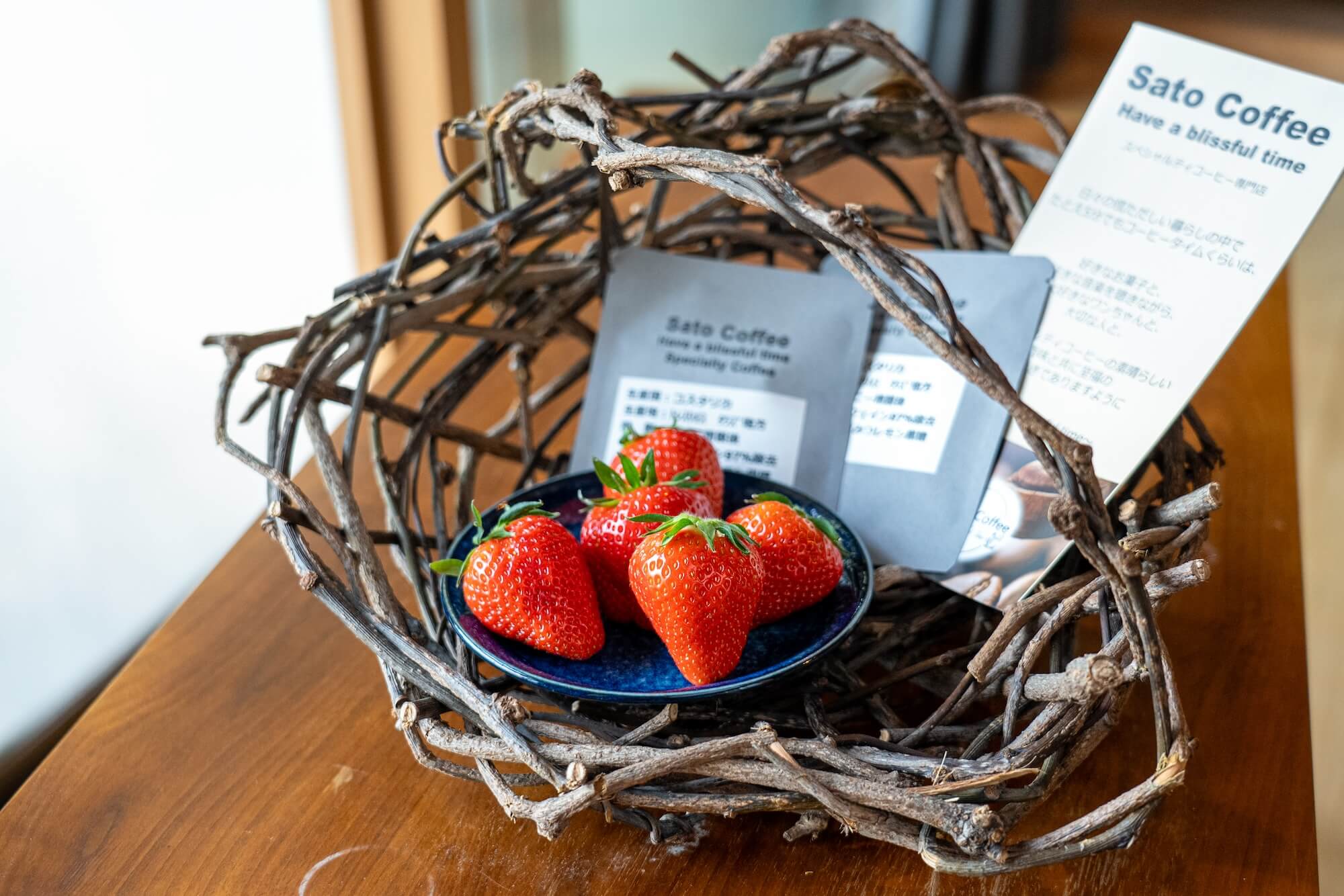 ウェルカムサービスのご用意もあり、この日は紲yaの近くにある「いぶき農園」の大粒いちごと、同じ地域にあるスペシャルティコーヒー専門店「Sato Coffee」のドリップコーヒーでした。