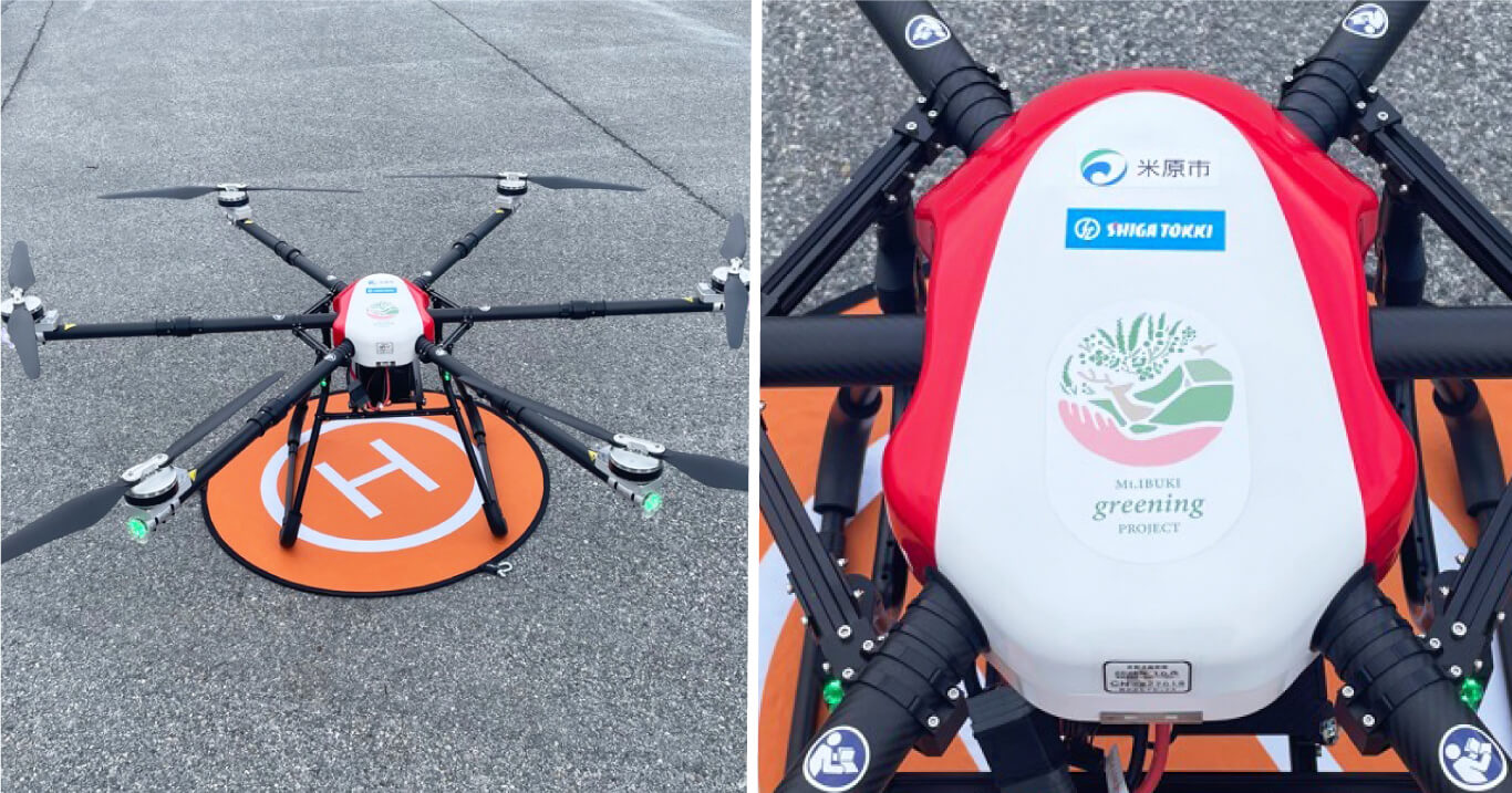 たとえば、滋賀特機株式会社さんからいただいた寄付は、「伊吹山の植生復元プロジェクト( https://www.city.maibara.lg.jp/mtibuki/syokusei_project/index.html )」に活用され、いただいた寄付金を財源として、2023年11月に運搬用ドローンを導入しました。ドローンには企業名のロゴシールを貼り、伊吹山南側斜面の復旧作業現場などで実際に活用されています。