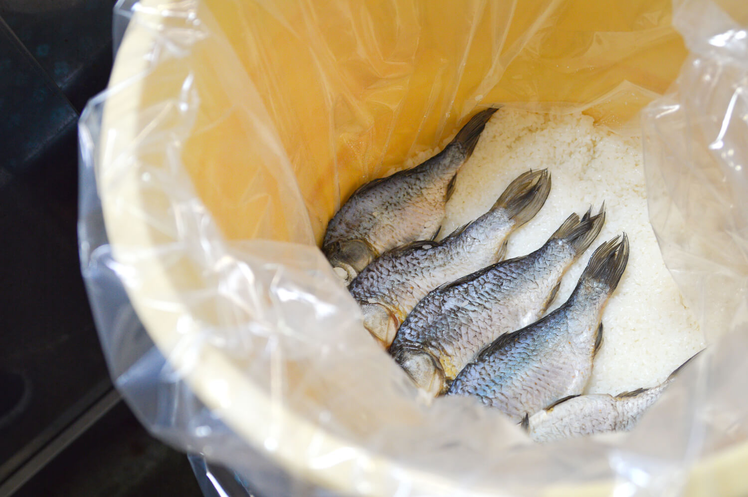 魚とご飯を交互に重ね、数か月から1年以上樽に漬け込んだら、完成。