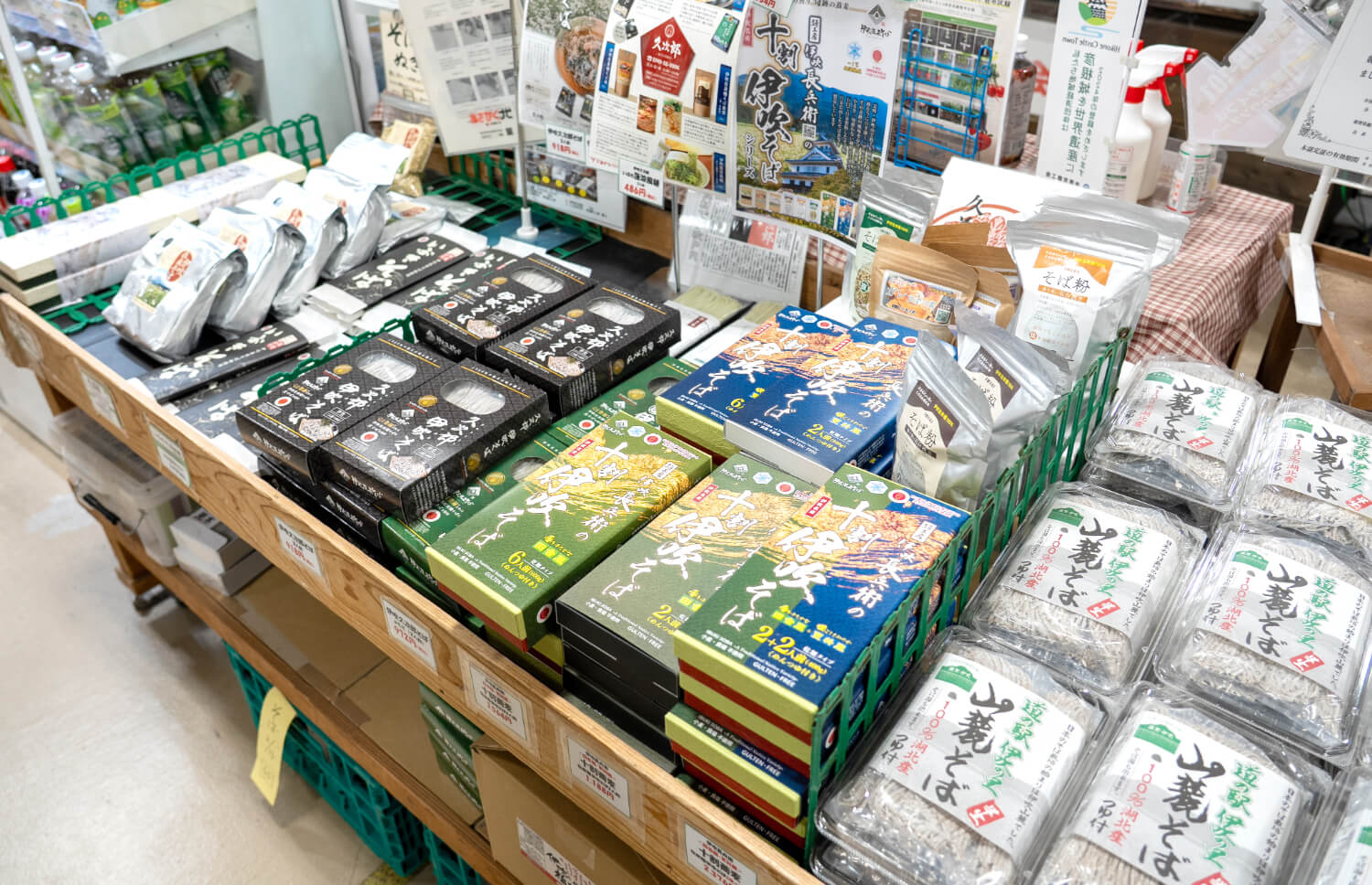 伊吹山のふもとにある道の駅「伊吹の里 旬彩の森」には、伊吹在来そばのそば粉や加工品、伝統野菜の伊吹大根を使った商品がずらりと並びます。
